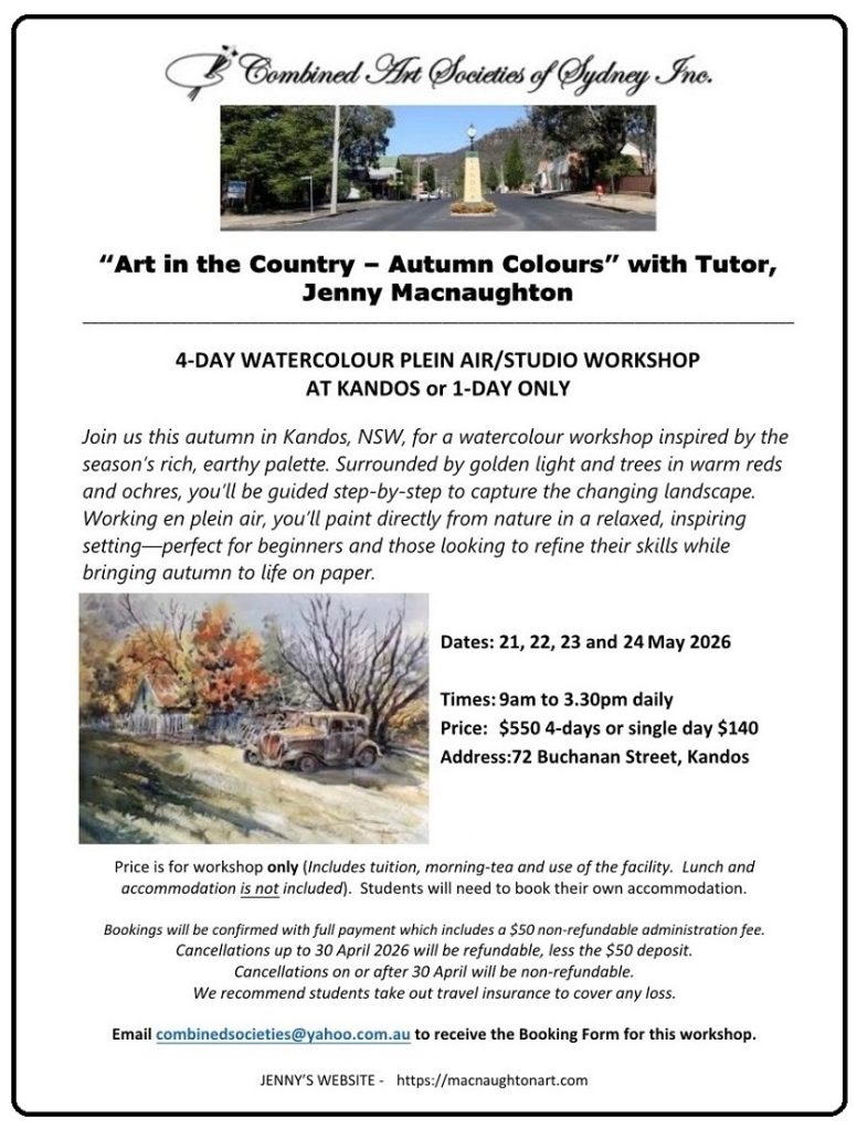 Jenny will guild you through the process of outdoor landscape painting to capture the beautiful Autumn colours. Although plein-air is the main focus, the workshop will only be outdoors if the weather permits, otherwise the classes will be held in the spacious well equipped studio.