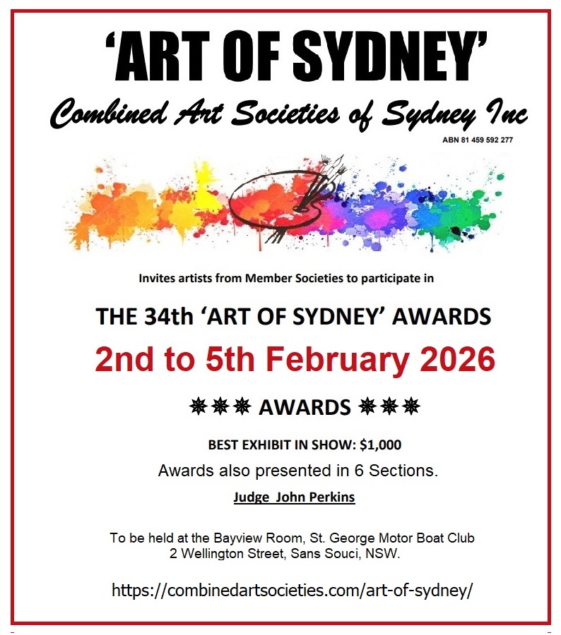 Our regular annual event, the Art of Sydney Awards Exhibition was held in March. A premium event which showcases the work of artists from our 12 member societies which together are the Combined Art Societies of Sydney (CASS).